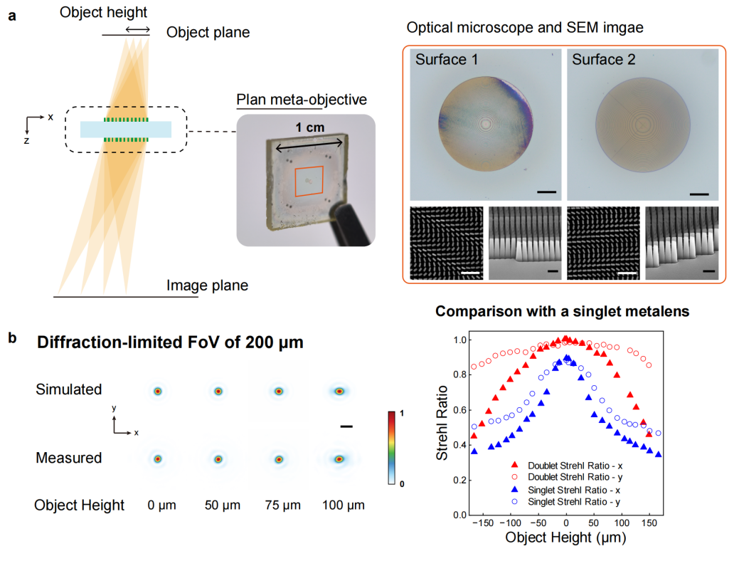 图2:a 单片双面平场超构物镜设计示意图与实物图。b 仿真模拟与测量表征的不同视场位置的点扩散函数;单片超构透镜与平场超构物镜不同视场点扩散函数的斯特列尔比对比图