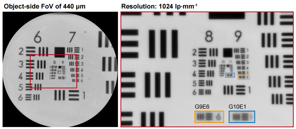 图3:部分相干照明平场超构物镜全视场成像效果和高分辨率线对局域放大图像