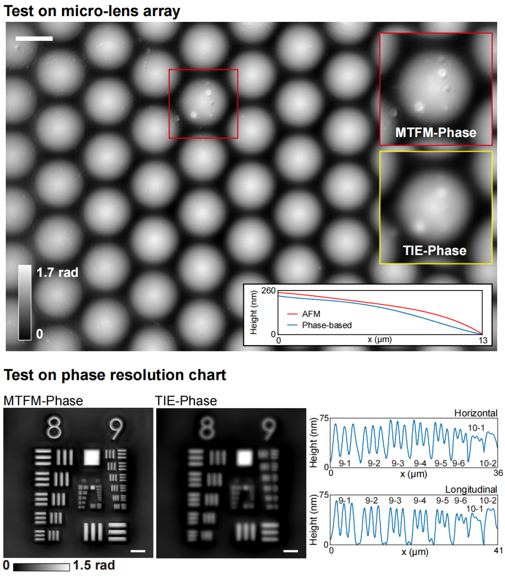 高分辨混合传递函数相位成像方法。对于一般的定量相位成像而言,成像系统的硬件决定了系统的极限分辨率,而软件即相位恢复方法决定相位成像效果是否能达到该极限分辨率。以往基于超构表面相位成像研究的相位恢复方法依赖高空间相干度照明,无法处理部分相干照明下的相位传输问题,难以恢复出高分辨、高精度的相位信息。研究团队引入混合传递函数方法,即融合光强传输方程和弱物体传递函数方法,确保恢复的相位信息具有较为准确的低频包络和清晰的高频细节。研究团队分别在相位分辨率板、微透镜阵列、透明细胞三种样品上展示了高分辨、高精度定量相位成像效果(图4和图5),并测量表征得到该技术的相位测量精度为0.06个波长,横向分辨率半宽为488纳米。
