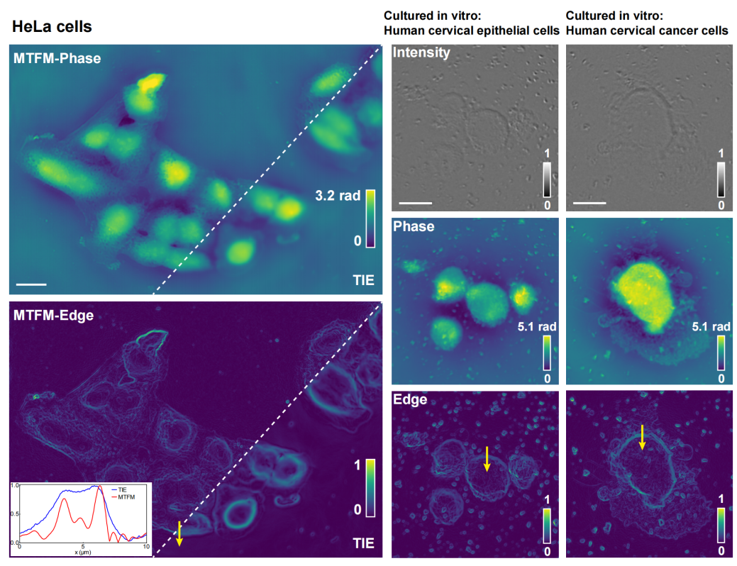 图5:部分相干照明下,混合传递函数和光强传输函数对HeLa细胞,体外培养人宫颈上皮细胞和癌细胞相位成像对比图。图中的比例尺都为20微米
