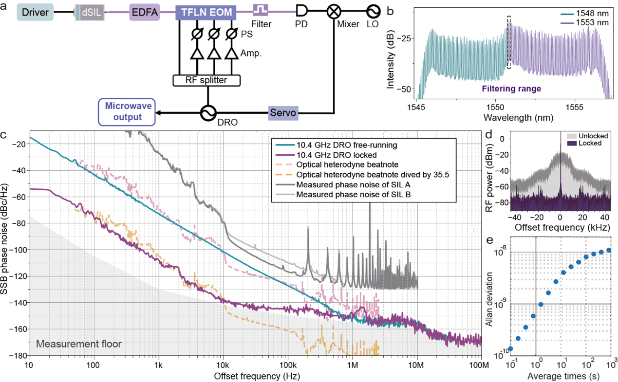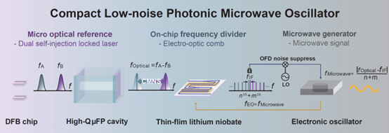 随着雷达探测、高速无线通信和精密测量对微波信号日益严苛的性能需求,传统电子振荡器在相位噪声、频率稳定性以及体积功耗方面逐渐面临瓶颈。相比之下,微波光子技术可以借助光学参考极高的频率稳定度,将光频域的优异相干性转移至电频域,从而突破纯电子振荡器对高频、低噪声信号产生的限制。然而,现有的光子-微波振荡器通常依赖复杂电学锁定系统,难以同时兼顾低噪声性能与工程可用性,成为制约其走向实际应用的重要因素。研究团队构建了基于光学锁定的微型光学参考源,实现了以往需要复杂电学锁定才能产生的低噪声光学参考,并进一步借助薄膜铌酸锂(TFLN)电光频率梳作为高性能分频器,将光学稳定性相干转移到微波域,在紧凑系统中实现低噪声光子-微波振荡器。