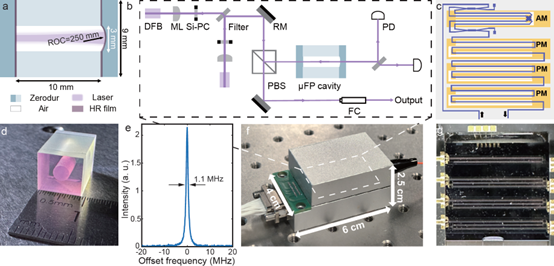 首先,研究团队基于微光学系统将两个分布式反馈(DFB)激光器通过自注入锁定的方式,耦合到体积仅约1 mL、Q因子超过108的空气间隙微型法布里-珀罗(μFP)光学参考腔之中,并实现全电驱动的一体化封装,体积约为60 mL。由于多路光学链路共同参考同一腔体,腔体振动与热扰动带来的共模波动可被天然抑制,实现大于20 dB的共模噪声抑制。进一步地,研究团队采用TFLN级联调制器生成的双电光频梳作为分频器件,将稳定的光学参考相干地细分、并最终锁定到目标微波载频,实现光学稳定性向X波段微波的转移。
