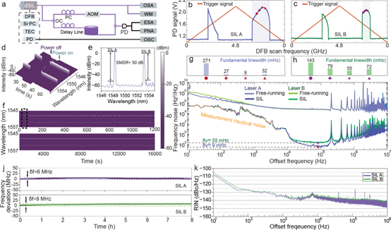 研究团队对封装的微型光学参考源的性能开展了详细表征。该封装模块支持启钥式同时锁定的可靠启动,两路超窄线宽激光分别位于1548.3 nm与1553.3 nm附近,形成约625 GHz的光学参考,输出光谱边模抑制比>50 dB。通过测试得到两路锁定带宽分别约 1.77 GHz 与 0.82 GHz,由测量的频率噪声推得的两路激光本征线宽分别达到 9 mHz 与 55 mHz,在自由运转的情况下,测得 8 小时内中心频率漂移仅为数 MHz;功率稳定性方面,两路参考激光相对强度噪声(RIN)在 10 kHz 以上偏移频率均低于-135 dB/Hz。